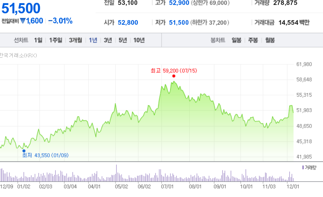 3. 과거 2025년 7월에는 장중 59,200원까지 상승하며, 52주 신고가를 기록한 바 있습니다. 이는 2002년 민영화 이후 가장 높은 주가 수준이라는 분석이 있었습니다.