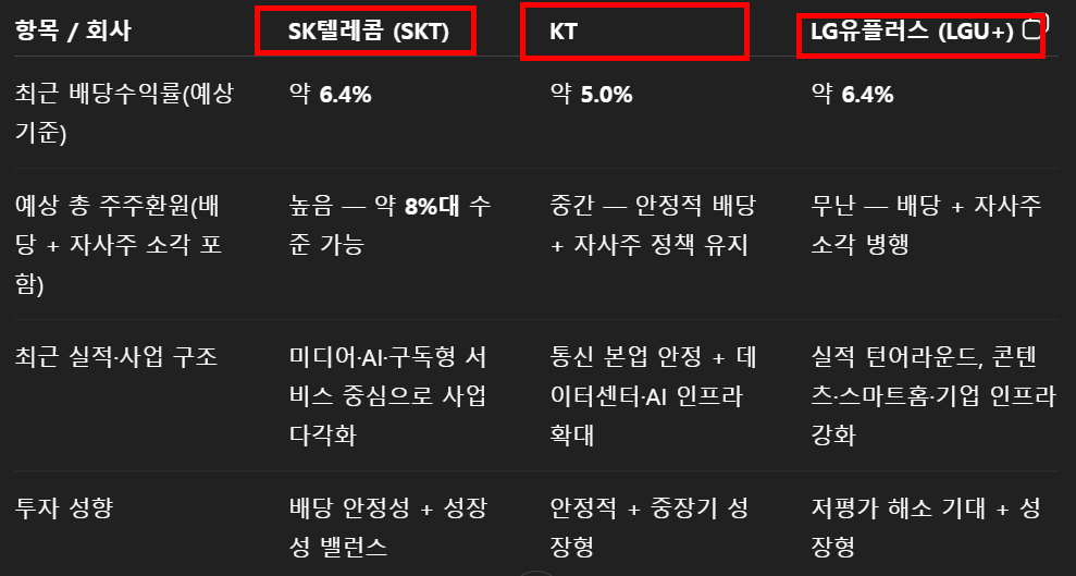 → 즉, KT는 통신사 치고 비교적 안정적으로 배당 + 자사주 환원을 통해 주주환원에 충실한 기업으로 평가받고 있습니다.