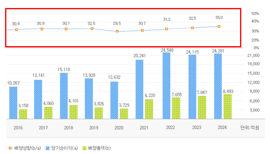 첫째, 안정적인 배당금과 꾸준한 배당성향을 유지하고 있어 배당 투자자에게 매력적이다.